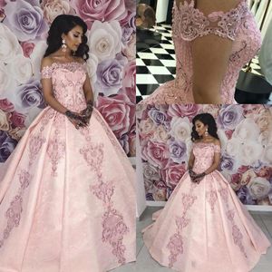 2019 New Arabic Pink Puffy Ball Gown Quinceanera Dresses Lace Appliques Long Sleeves Tulle With Detachable Train Party Prom Evening Gowns